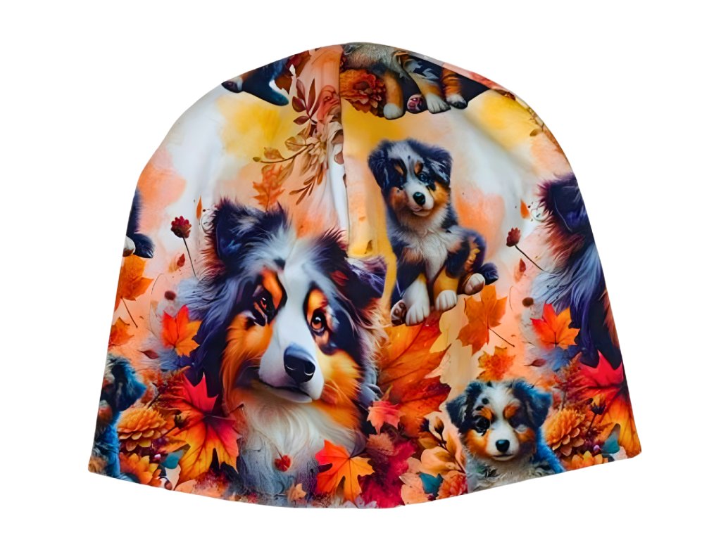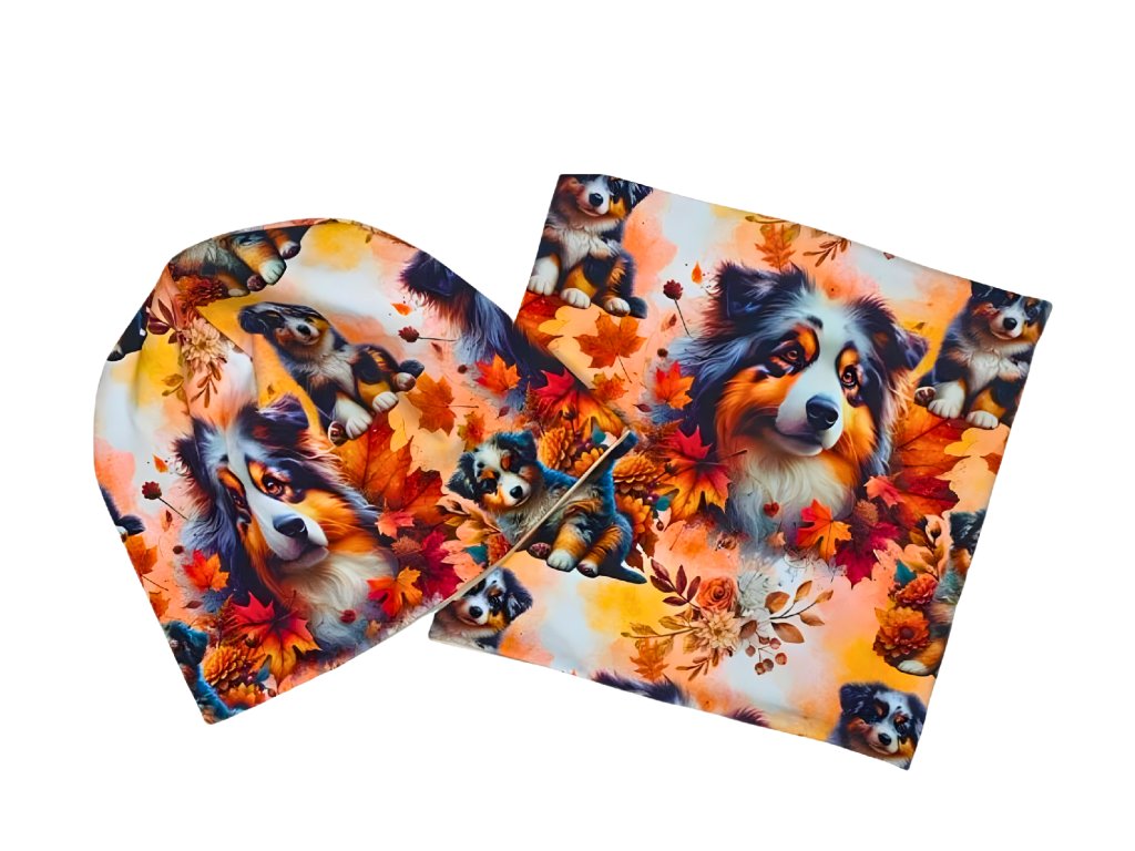 🐾 Set s motivem australského ovčáka – krátká čepice + nákrčník z bavlny, ideální na podzim/jaro.