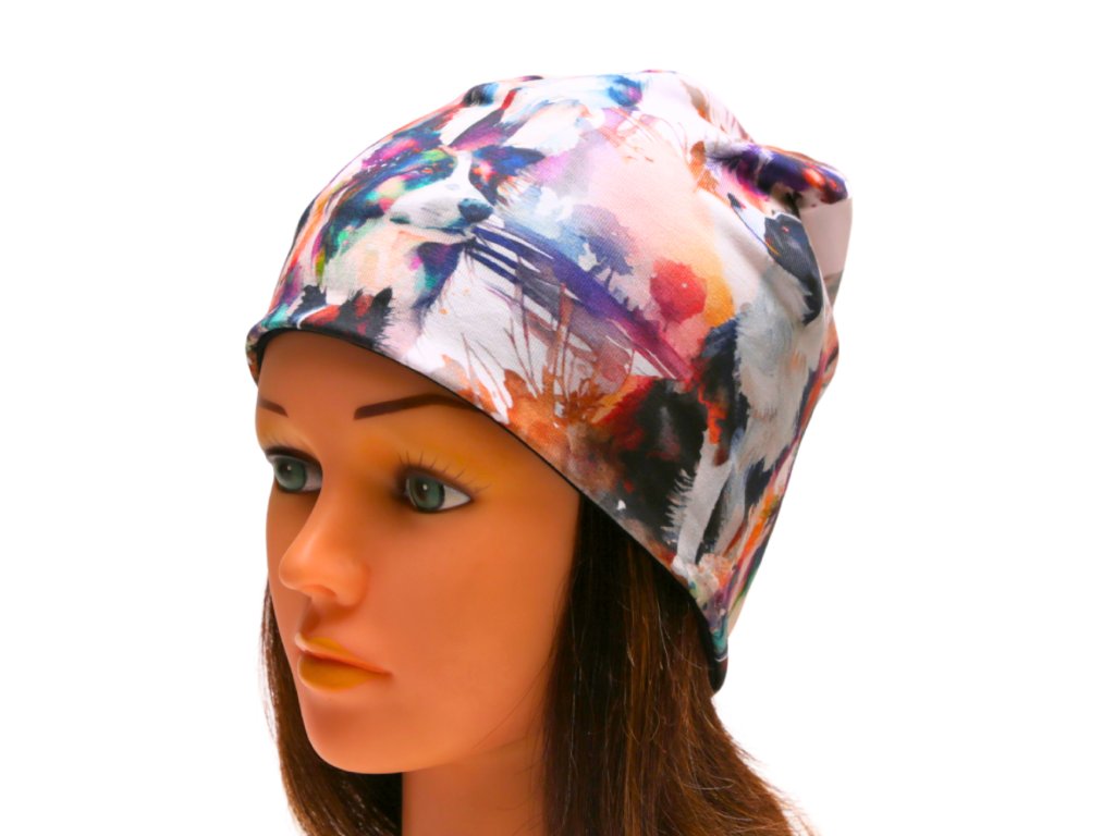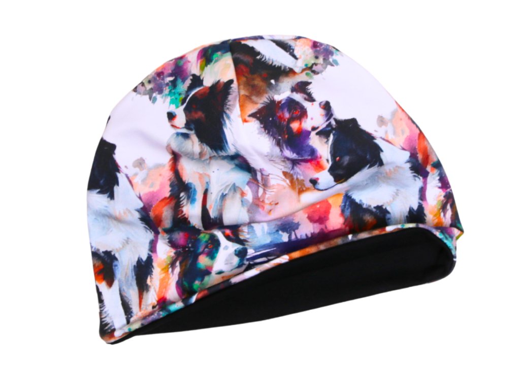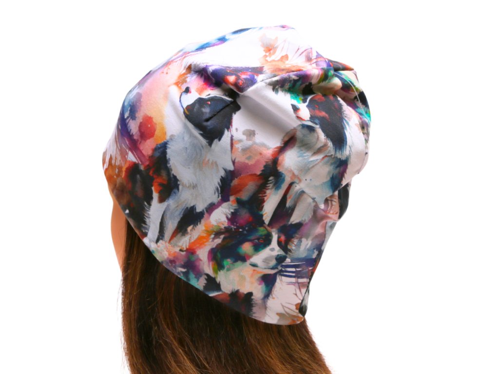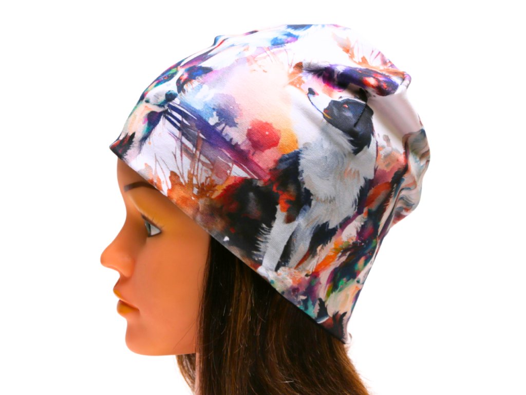 🎨 Jemná podzimní/jarní čepice s akvarelovým motivem border kolií – pružná, pohodlná a stylová.