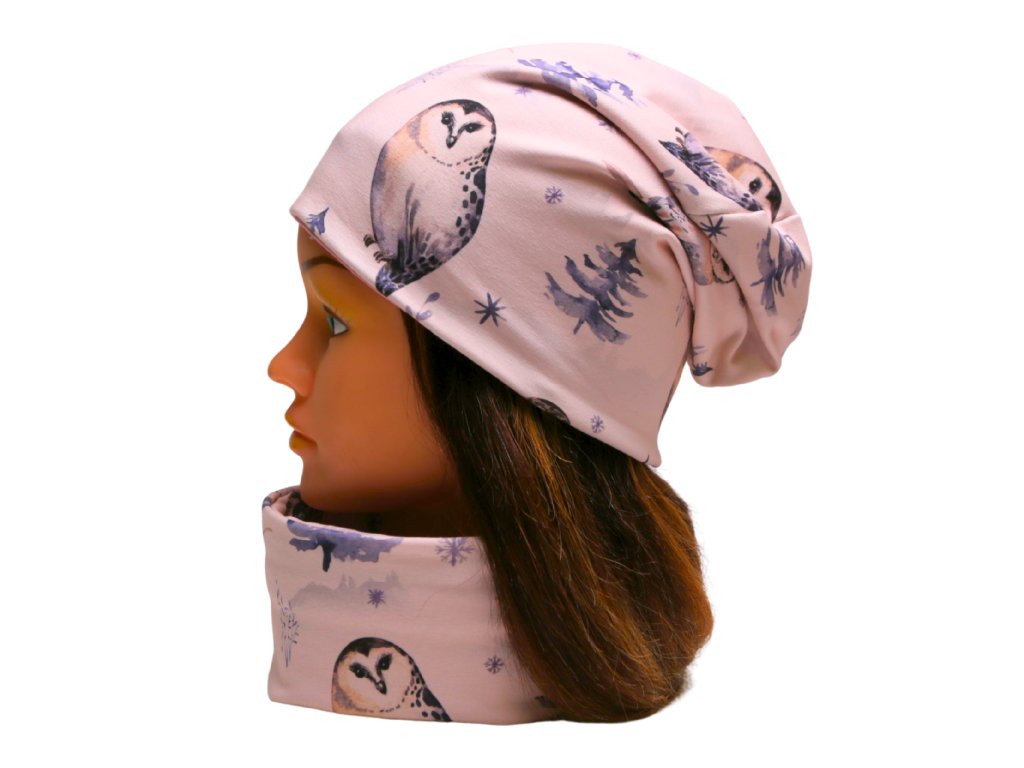 Set s přepadlou čepicí a nákrčníkem v jemném sovím designu. Styl, pohodlí a česká ruční práce. 🦉💗