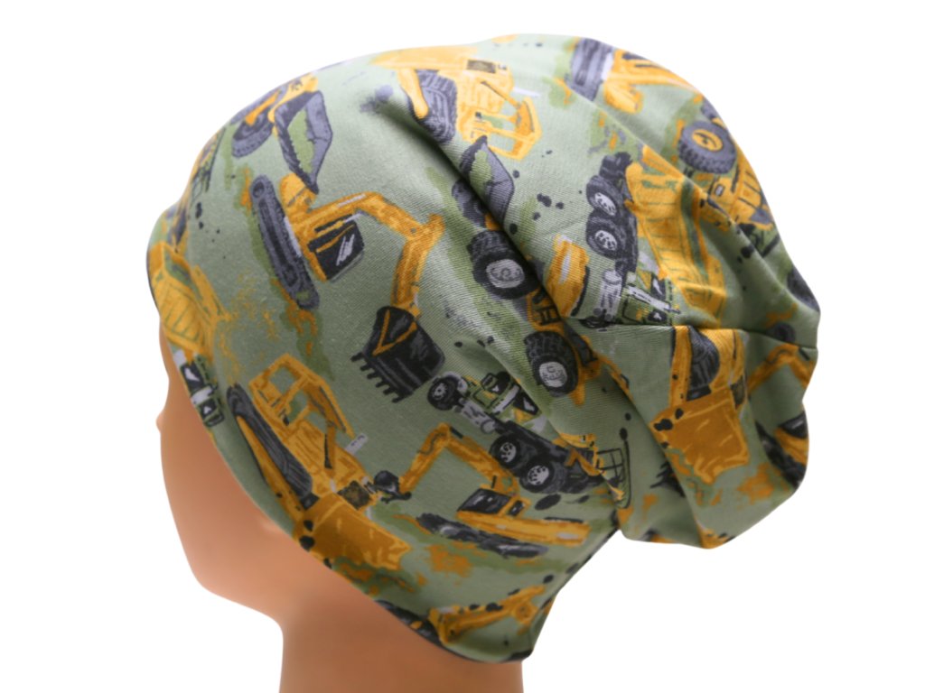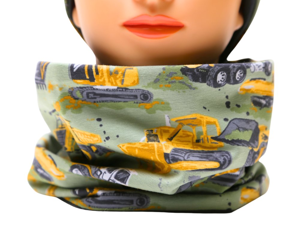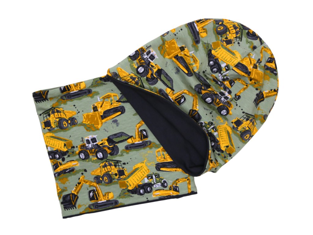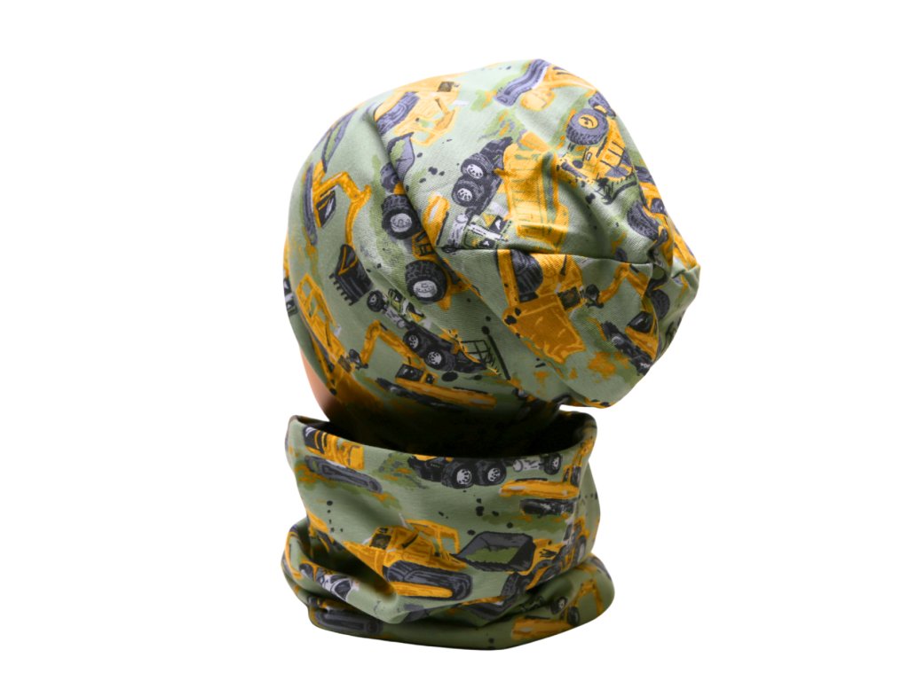 Set dlouhé čepice a nákrčníku s motivem bagrů a traktorů. Originální kousek z naší české dílny pro malé stavitele. 👷♂️