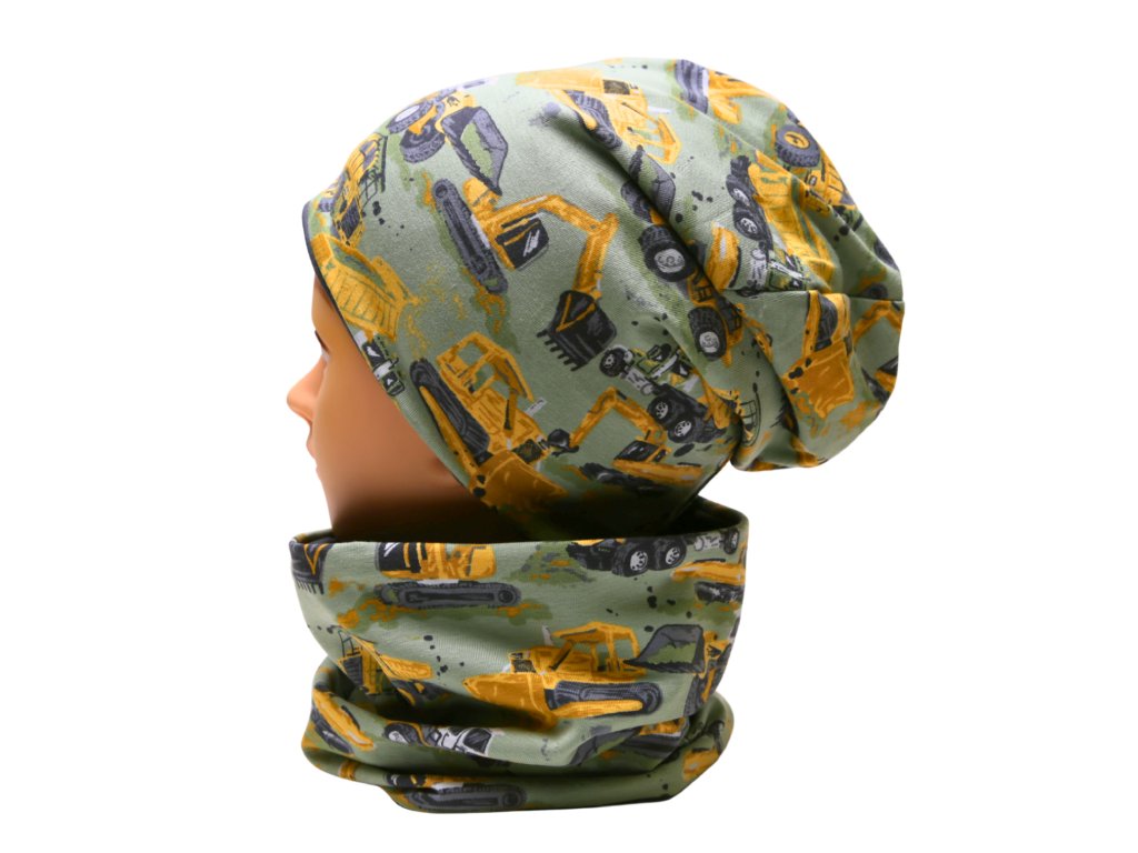 Stylový set dlouhé čepice s přepadlým střihem a nákrčníku potěší každého milovníka strojů 🚜
