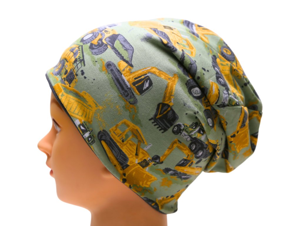 ČEPICE HOMELESS (s přepadem) + NÁKRČNÍK - STAVEBNÍ STROJE NA ZELENÉ - bavlněná tmavě šedá podšívka