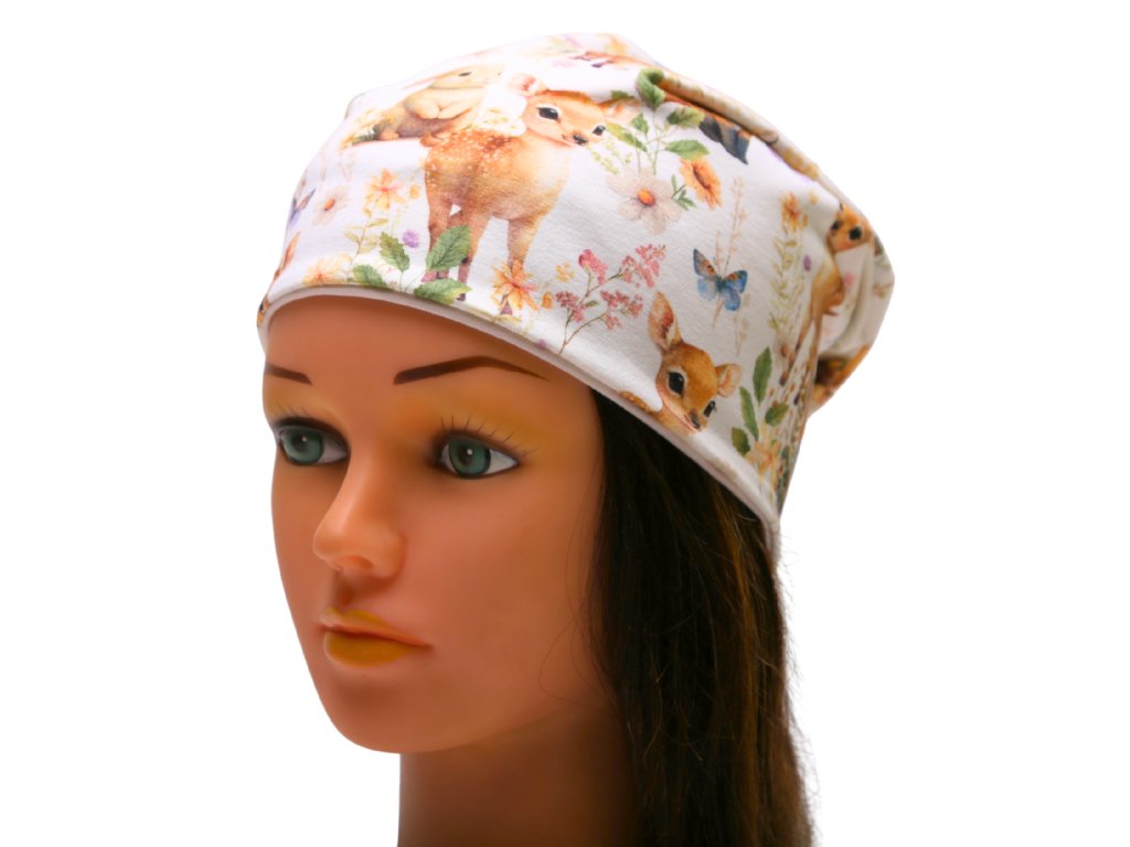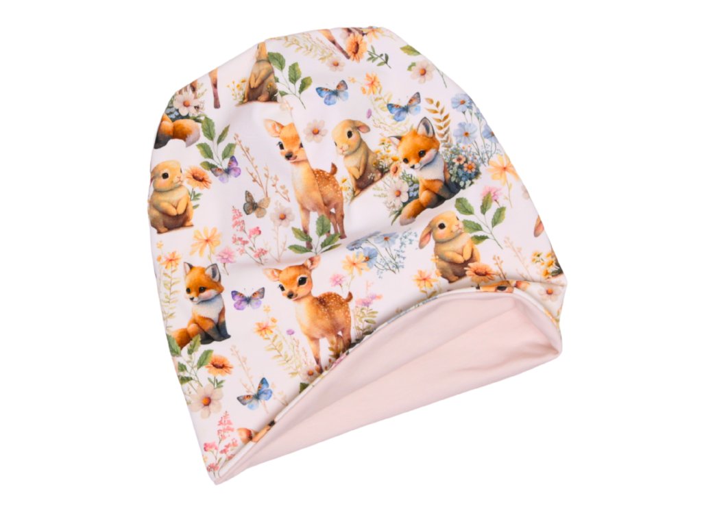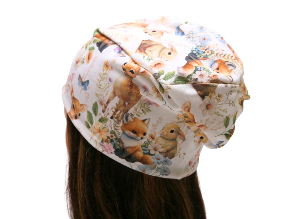 Lehčí delší čepice (homeless střih) s motivem srnek, lištiček a zajíčků 🌿 Vhodná na jaro, podzim i pod helmu.