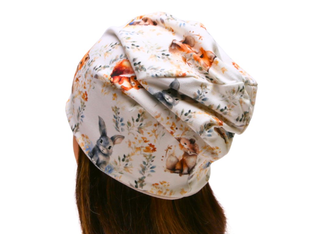 Delší bavlněná čepice (homeless) s motivem lesa a podzimních zvířátek 🍂 Perfektní na jaro, podzim i pod helmu.