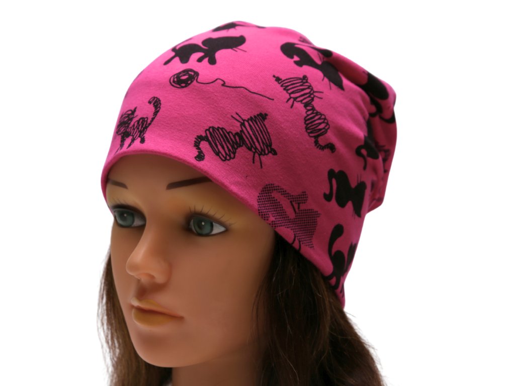 Stylová dětská čepice s motivem kočiček na růžovém podkladu