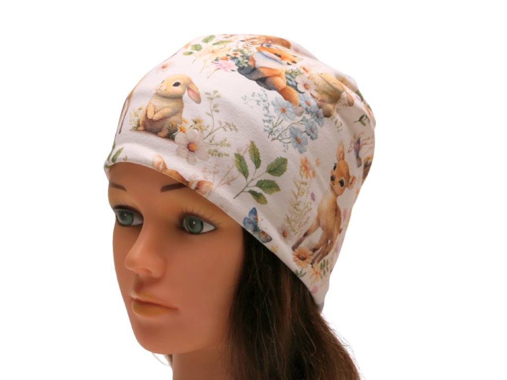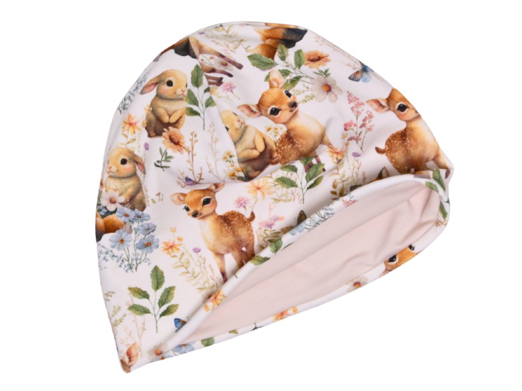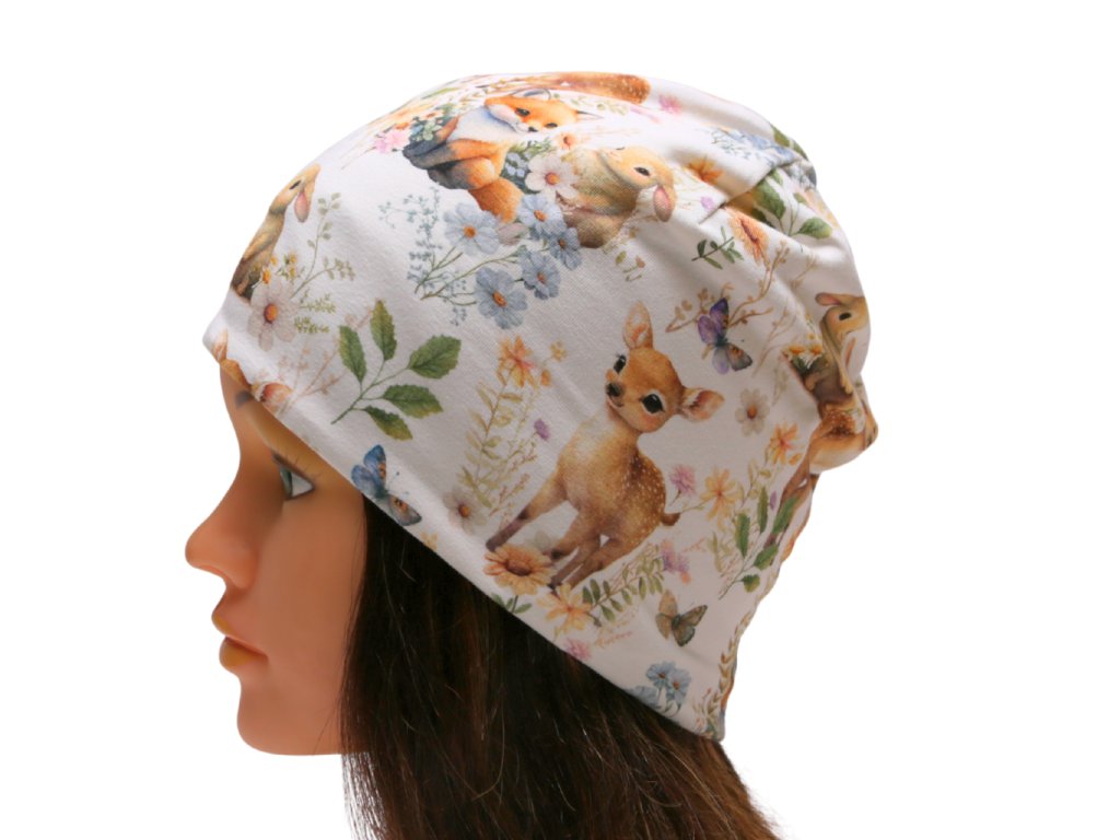 Lehká bavlněná čepice s motivem srnky, lištiček a zajíčků 🌿 Ideální na jaro, podzim i pod helmu.