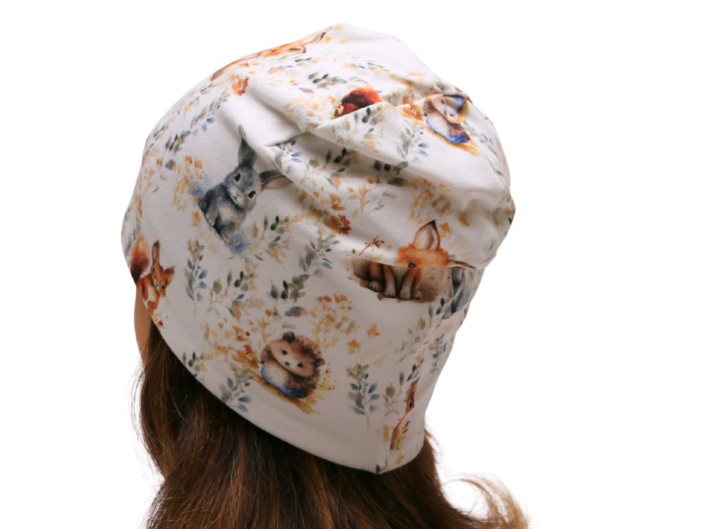 Lehká bavlněná čepice s motivem lišky, ježka a veverky 🍁 Ideální na jaro, podzim i pod helmu.