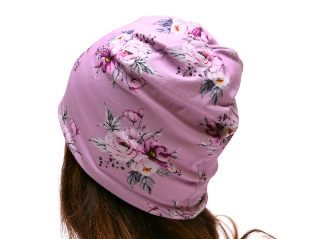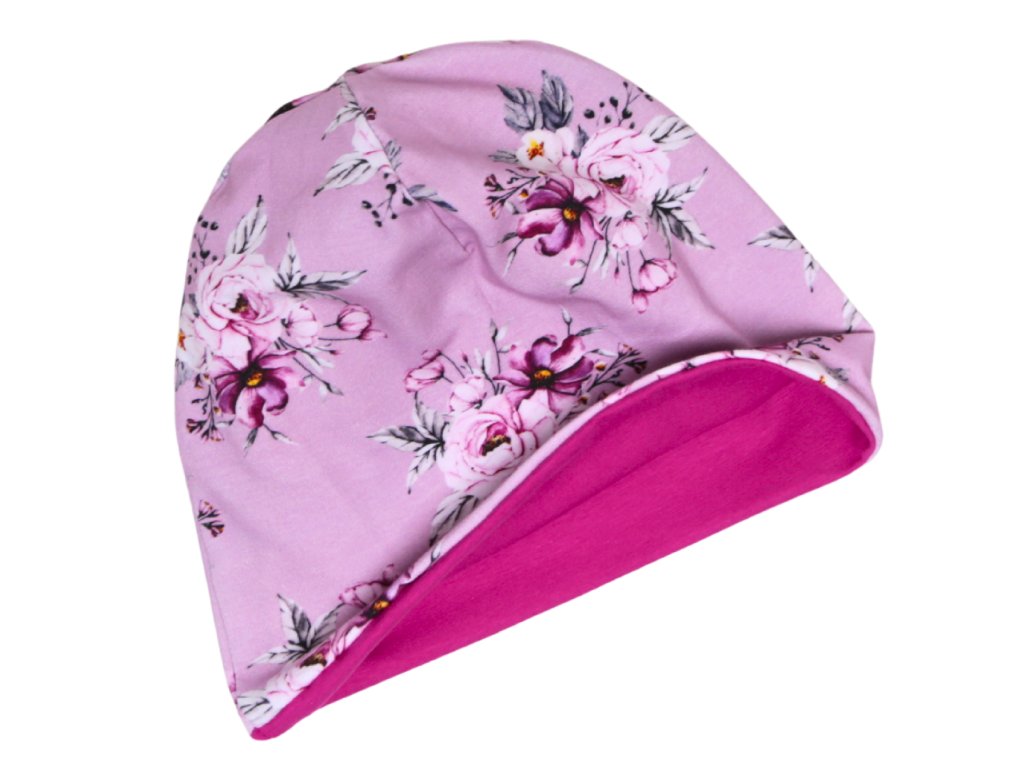 Čepice + nákrčník - KVĚTINY NA FIALKOVÉ - bavlněná fialová podšívka