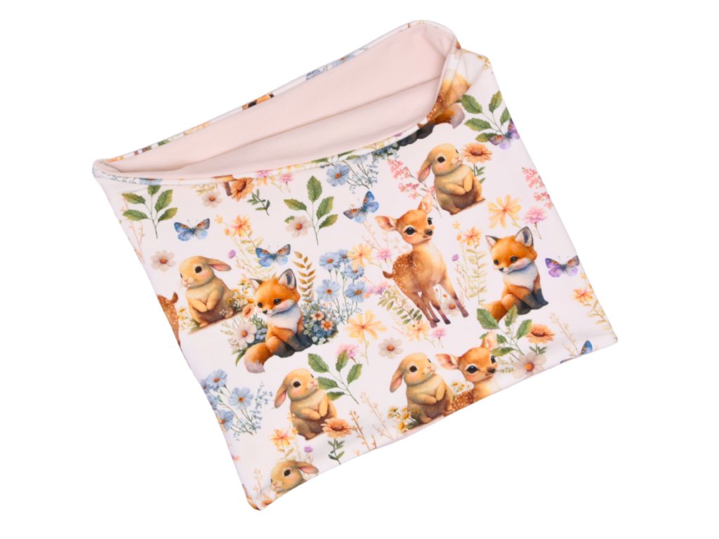 Lehký bavlněný nákrčník s motivem lesních zvířátek 🧡 Ideální na jaro, podzim, do školky i školy.