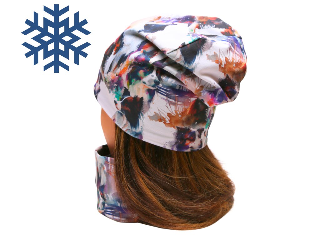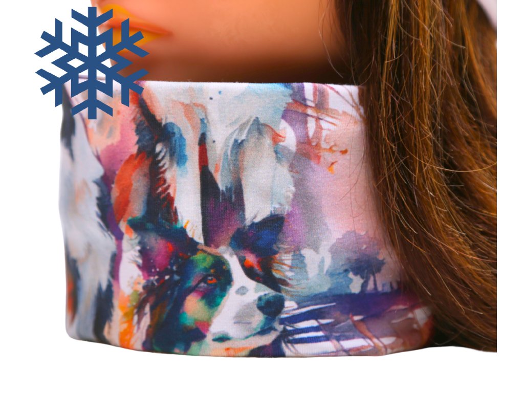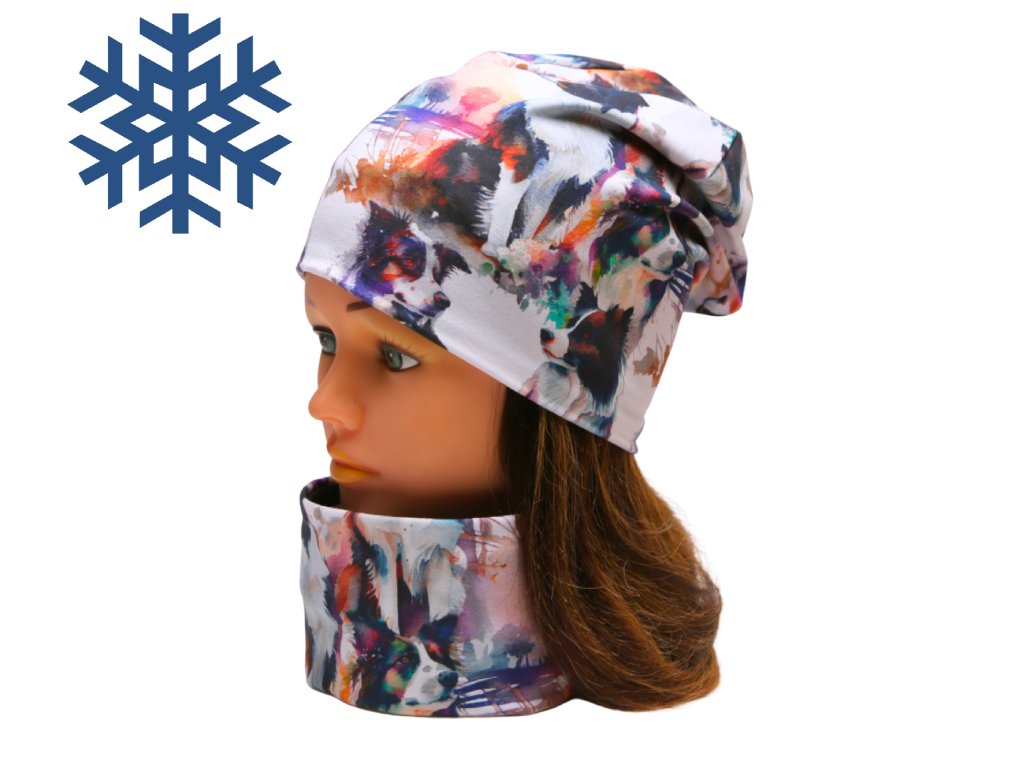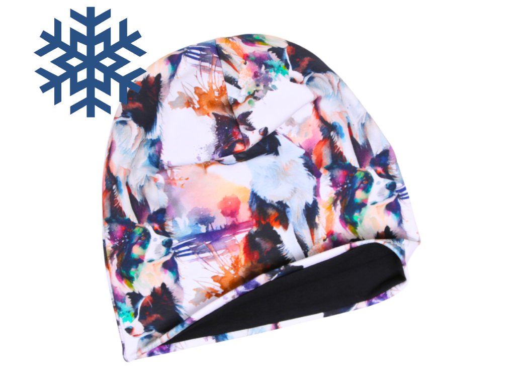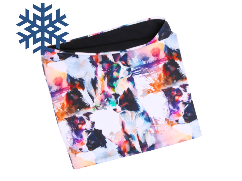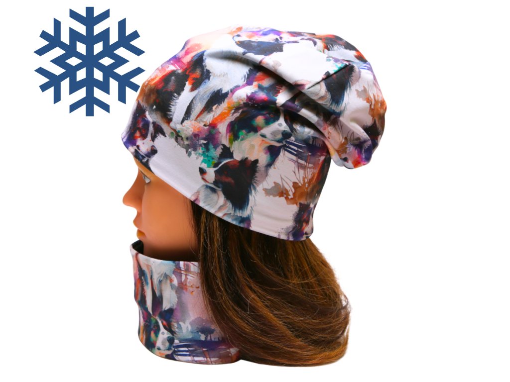 Zimní čepice homeless (s přepadem) a nákrčník - BORDER KOLIE - AKVAREL - fleecová černá podšívka