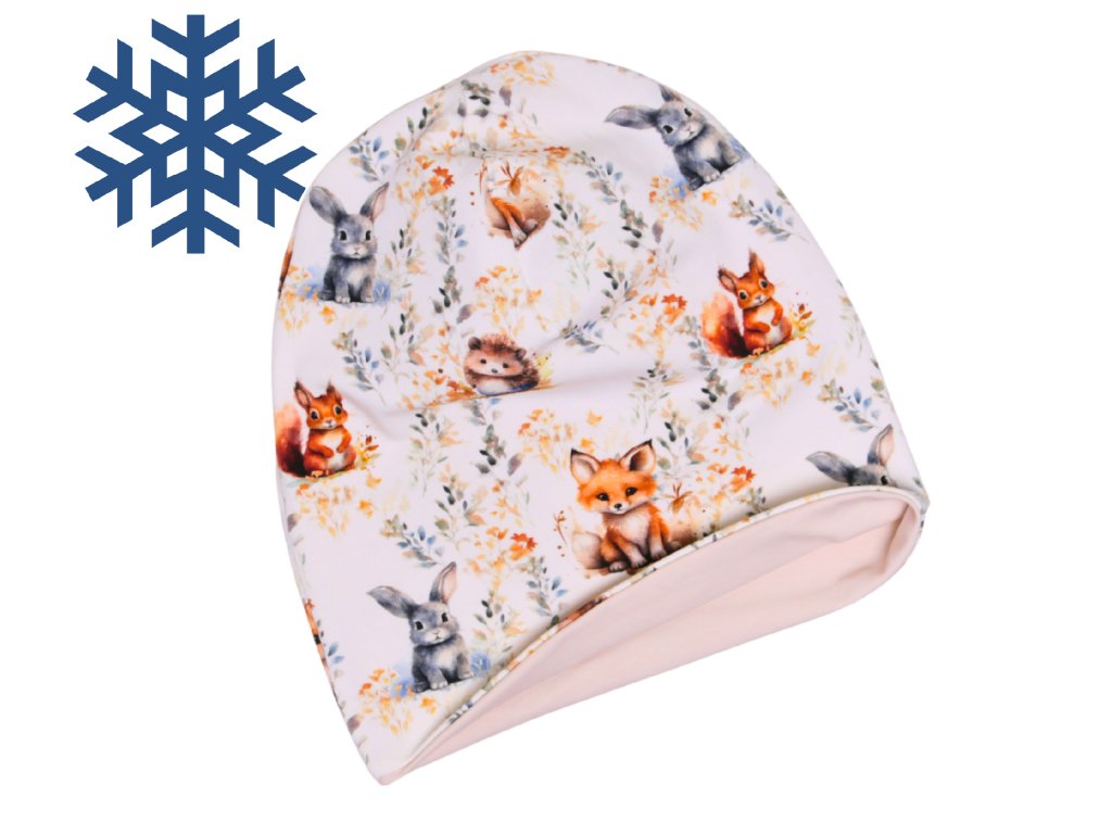 Set Listopadové lesíky v delší variantě čepice je kombinací stylu a tepla. Čepice má lehce přepadlý střih, nákrčník krásně sedí a obojí je vybaveno fleecovou podšívkou. Motiv podzimního lesa s liškami a ježky působí útulně a vřele.