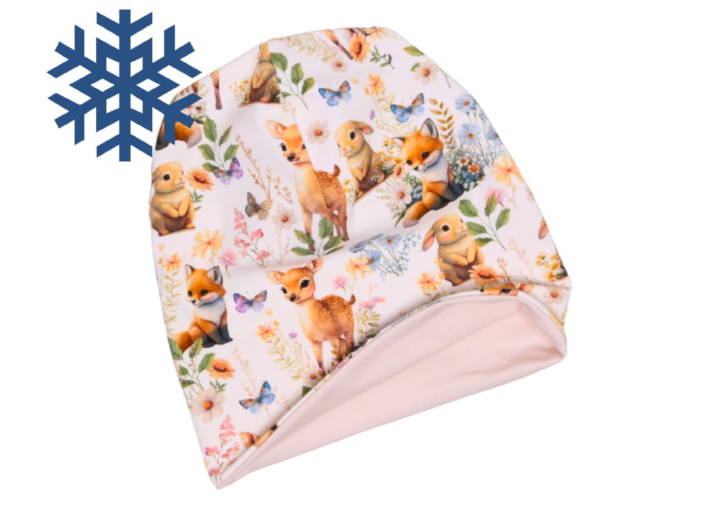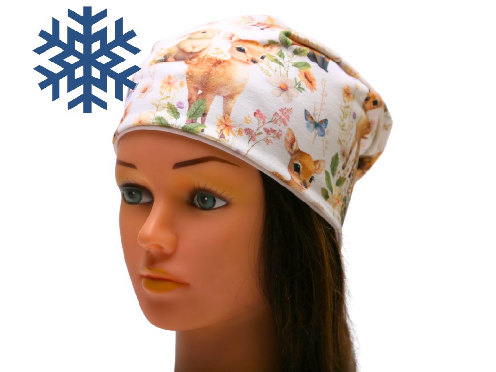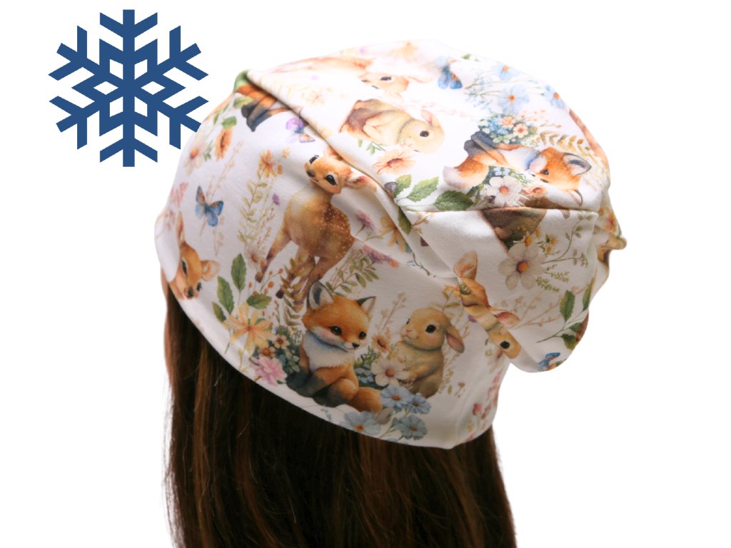 Pro milovníky stylu i pohodlí. Dlouhá čepice Lesní pohádka má jemný spad vzadu, působí volněji, ale díky krémovému fleecu uvnitř skvěle hřeje. Jemný motiv srnky, lišky, zajíčků a kvítků působí něžně a originálně.