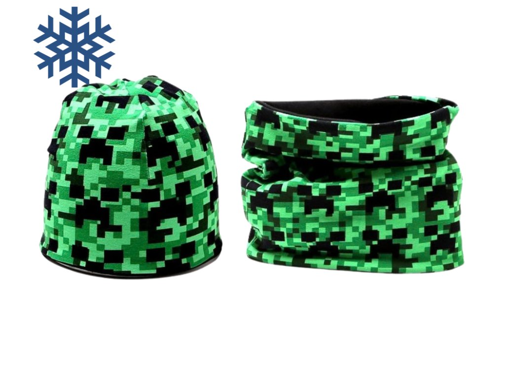 🟩 Zimní set čepice a nákrčníku s pixelovým motivem a černým fleecem.